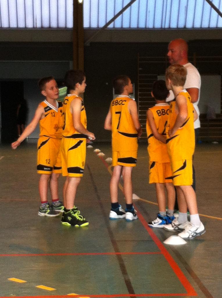 Les jeunes pousses du club écoutent les conseils de leur coach Benoît à la mi-temps.