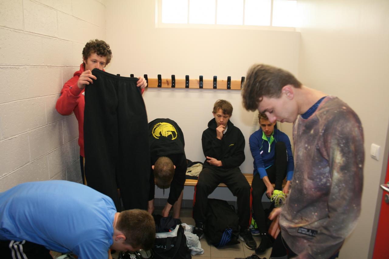 Les garçons, dans le vestiaire, se préparent pour le début des hostilités.
